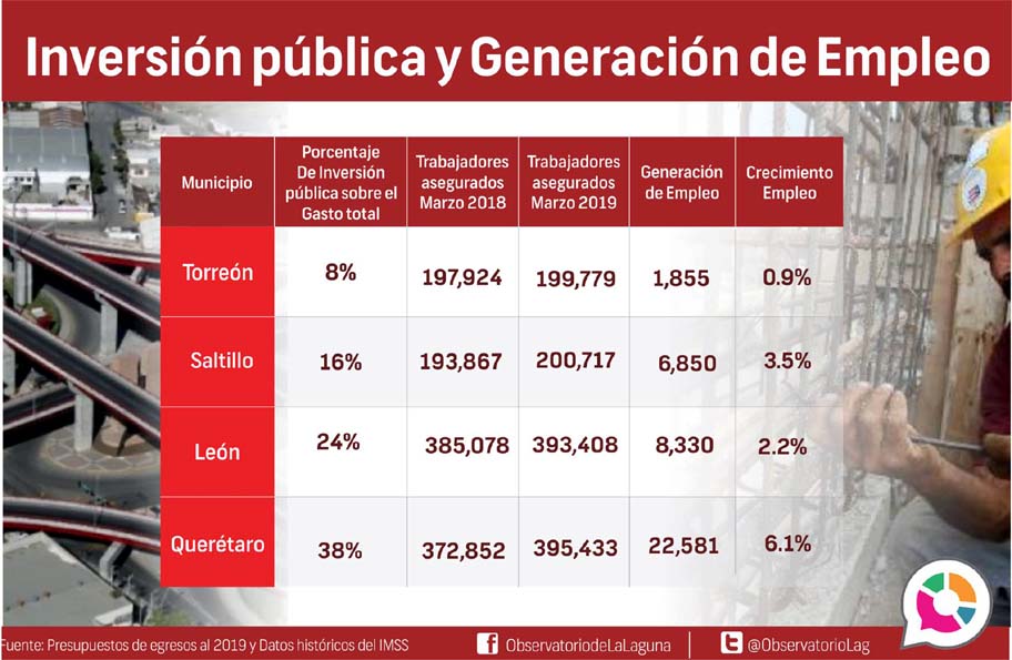 En el año 2018, de las instituciones educativas de nivel superior y técnico en de la Comarca Lagunera egresaron en promedio entre 6 mil 400 y 6 mil 507 profesionistas, de acuerdo cifras del Observatorio Laguna y de la Universidades e Instituciones de Educación Superior (ANUIES), sin embargo, la región sólo ha generado 4 mil 196 oportunidades laborales, es decir que sólo 64.5% de esta población tuvo posibilidad de colocarse en un empleo formal.