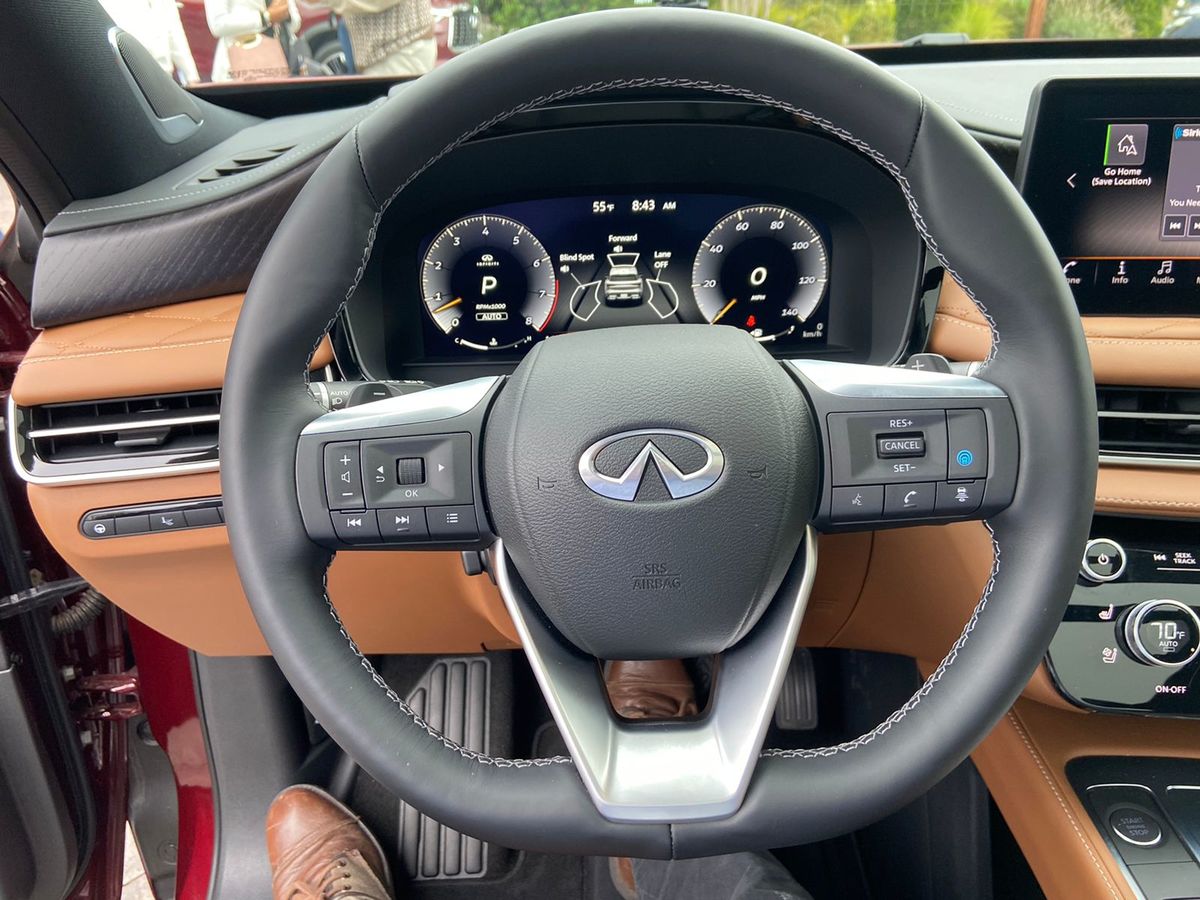 La QX60 2022 busca entregar una atmósfera de tranquilidad, suntuosa y tecnológica. Destaca el uso de insertos de madera de poro abierto, superficies acolchadas en paneles de tablero y puertas, así como uso masivo de cuero con patrones de rombos. La marca también informa que hay una mayor utilización de materiales aislantes con respecto de su predecesora para reducir la filtración de ruidos.
