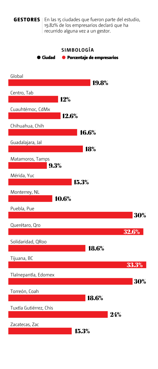 También hay gestores bien acreditados y formales, como ocurre en la misma Cuauhtémoc o en la ciudad de Querétaro, donde con todo y su empeño por digitalizar el gobierno, los pequeños empresarios no se libran de la necesidad de intermediarios. Como lo refiere Armando 'N', quien al ver su negocio cerrado luego de una inspección, alguien le recomendó recurrir a un gestor bien conocido en la zona del Bajío. Éste le pidió a Armando varios papeles, y en menos de una semana pero con un pago 10 veces superior al precio de la licencia, las cortinas de la tienda se volvieron a abrir.