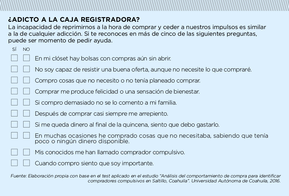 En 2013, una encuesta de la empresa CuponCabin.com afirmó que 15% de los estadounidenses adultos eran compradores compulsivos; en México no existen cifras al respecto, pero algunos datos sobre el uso de tarjetas de crédito en el país, publicados periódicamente por el Banco de México y la Comisión Nacional para la Protección y Defensa de los Usuarios de los Servicios Financieros (Condusef), indican que estamos en el mismo camino.