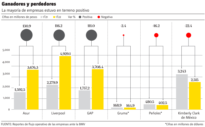 Kimberly Clark de México (KCM) e Industrias Peñoles registraron una reducción en su flujo operativo (Ebitda) de 22.4 y 16.2 por ciento, respectivamente, caso contrario a empresas como Grupo Aeroportuario del Sureste (Asur) y El Puerto de Liverpool, que lograron más que duplicar su rentabilidad en dicho periodo.
