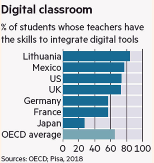 El diario inglés señala en su gráfica que "en algunos de los países más avanzados del mundo, menos de dos tercios de los estudiantes tienen profesores con las habilidades necesarias para integrar dispositivos digitales en sus clases. En Japón, menos de un tercio se encuentra en esa posición".