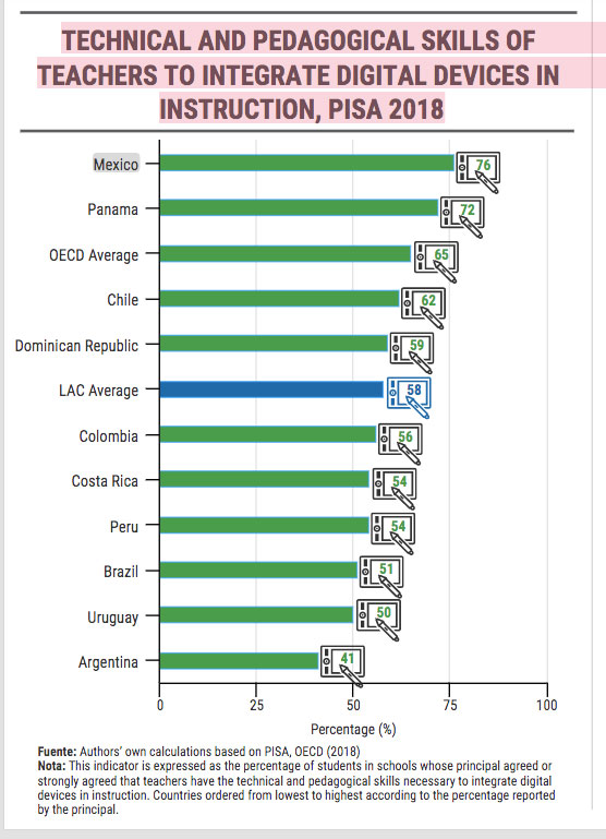En la región latinoamericana, sólo México y Panamá que supera 72% superan la media de la OCDE, en tanto que naciones como Chile (con 62%) y República Dominicana (59%) están por arriba del promedio de la región que es de 58% de los profesores con habilidades digitales. En el sótano están Argentina (41%), Uruguay (50%) Brasil (51%), Perú y Costa Rica empatados en 54%.