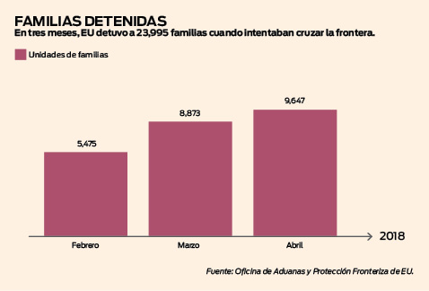En ese mismo mes, se detuvieron a 9,647 familias cuando intentaban cruzar a los EU, en comparación con 8,873 en marzo y 5,475 en febrero. En abril de 2017, solo se detuvieron 781.