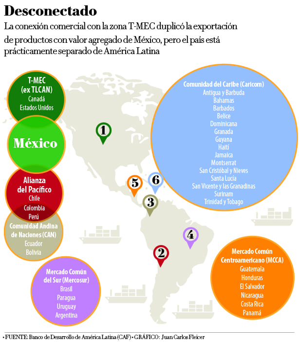 El país es líder en la región en exportaciones de valor agregado, esto por ser parte del tratado comercial con Estados Unidos y Canadá, el T-MEC, porque sus envíos de este tipo pasaron de representar 10 por ciento del total del país en 1990 a 20 por ciento en 2015, pero con el sur y Caribe del continente casi no tiene relación.