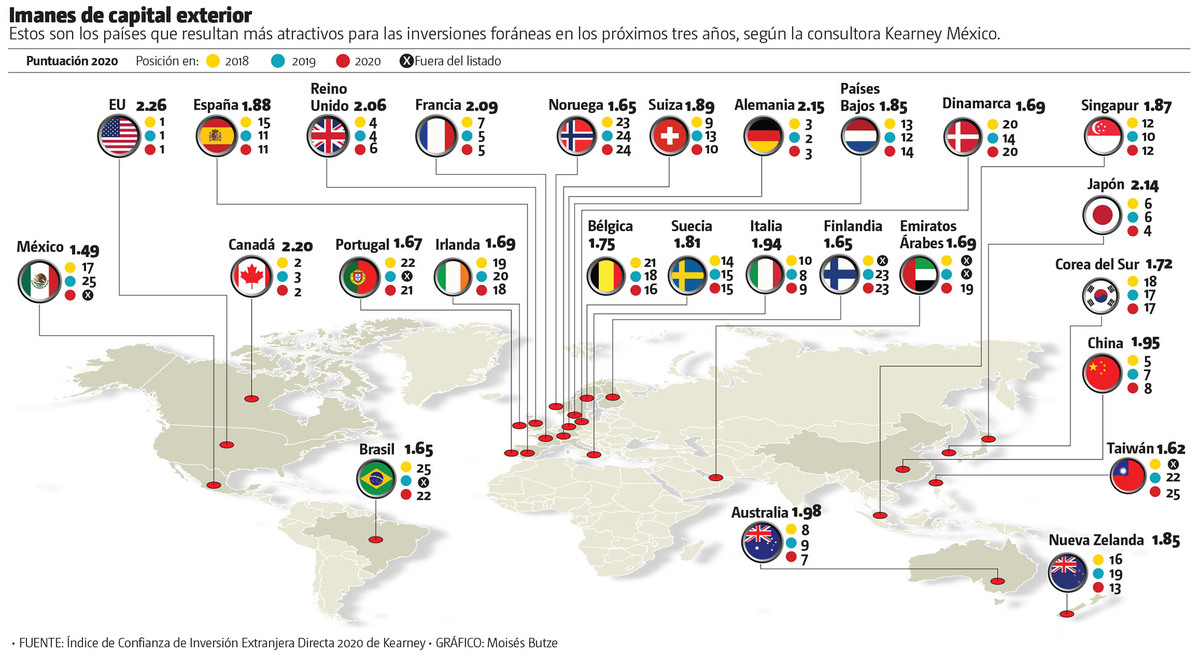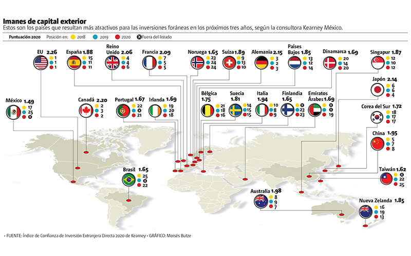 Debido a factores regulatorios y sobre todo de gobernanza, México quedó fuera del ranking de los 25 principales países que son atractivos para la inversión extranjera directa (IED) en 2020.