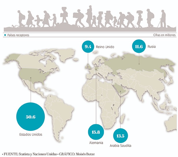 Alemania es el segundo país del mundo que más migrantes acogió el pasado año, con 15.8 millones de personas; seguido de Arabia Saudita (13.5 millones), Rusia (11.6 millones) y Reino Unido (9.4 millones).