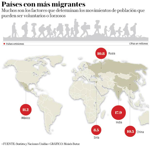 De acuerdo con el lugar de nacimiento de los migrantes internacionales, los rusos también son quienes más abandonaron su tierra, con 10.8 millones; China, con un poco menos, expulsó a 10.5 millones y los sirios fueron 8.5 millones.