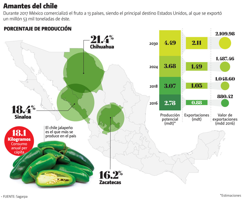 Mientras el crecimiento anual promedio de la producción de chile es de 4.82 por ciento, de acuerdo con la Planeación Agrícola Nacional de la Sagarpa está previsto que para el periodo 2016-2030 el crecimiento acumulado en la producción sea de 61.40 por ciento, mientras que para las exportaciones en millones de toneladas sea de 139.66 por ciento.