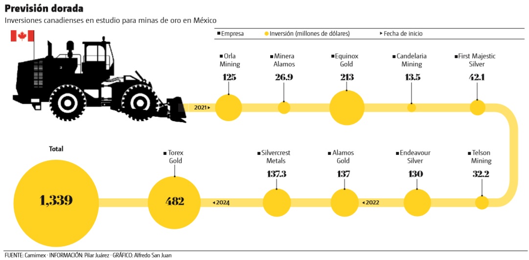 Entre los proyectos más relevantes de la inversión canadiense están los de Torex Gold, con 482 millones de dólares, en Minera Media Luna, Guerrero, previsto hacia 2024; seguido del de Equinox Gold, que prevé la expansión de Los Filos, que se estima costará 213 millones de dólares.