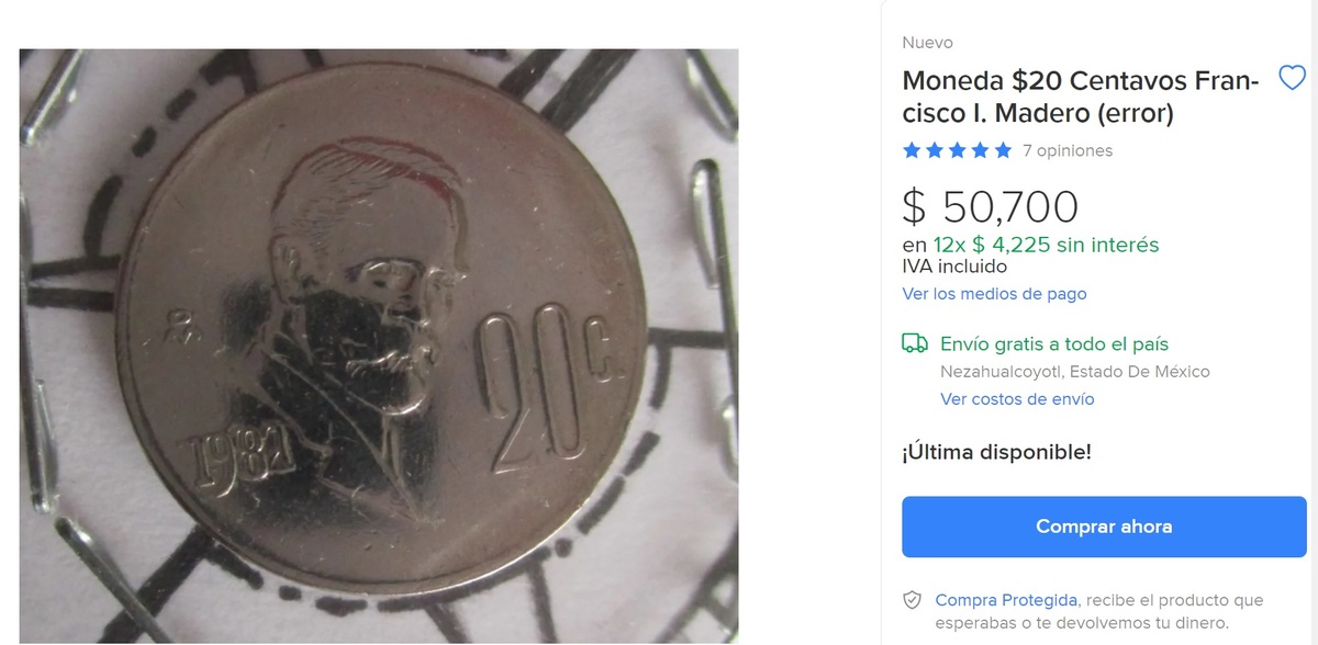 En las últimas semanas salió a la luz una moneda de 20 centavos de 1982, con la figura del ex presidente Francisco I. Madero, que se oferta hasta en 50 mil pesos en plataformas de comercio electrónico, como Mercado Libre.