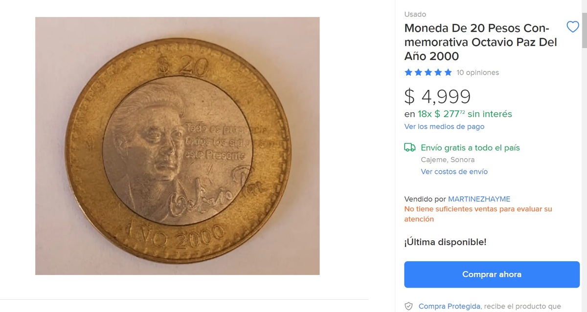 La moneda que fue puesta en circulación el 3 de abril de ese año ha alcanzado un valor de hasta 5 mil pesos en plataformas de internet, como Mercado Libre.