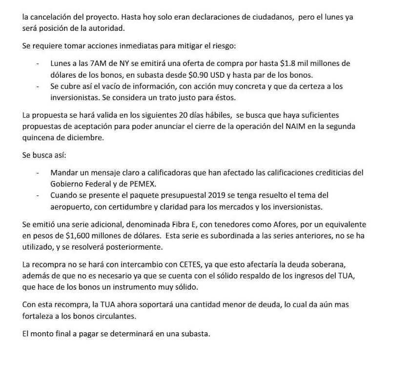 "Los bonos se emitieron bajo la ley de NY, que posibilita calificar los bonos en default técnico en ciertos casos. El riesgo más serio para las cuatro series de bonos del NAIM es el anuncio oficial de la cancelación del proyecto. Hasta hoy solo eran declaraciones de los ciudadanos, pero el lunes ya será posición de la autoridad", se refiere en la minuta.