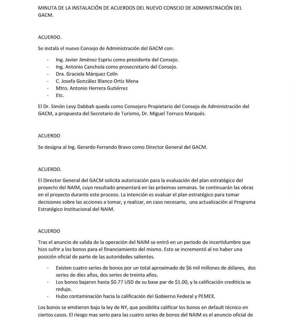 "El director general del GACM solicita autorización para la evaluación del plan estratégico del proyecto del NAIM, cuyo resultado presentará en las próximas semanas. Se continuarán las obras en el proyecto durante este proceso. La intención es evaluar el plan estratégico para tomar decisiones sobre las acciones a tomar, y realizar, en caso necesario, una actualización al Programa Estratégico Institucional del NAIM", de acuerdo con la minuta del Consejo de Administración del GACM.