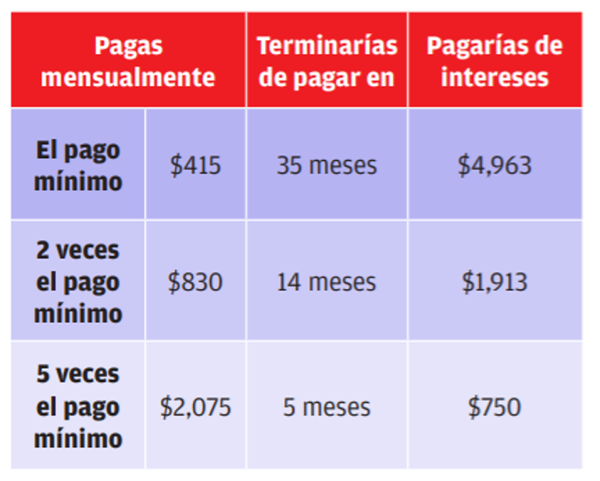 Por lo que si se paga cinco veces más del mínimo, la cantidad de intereses se reduce significativamente en más del 560 por ciento.