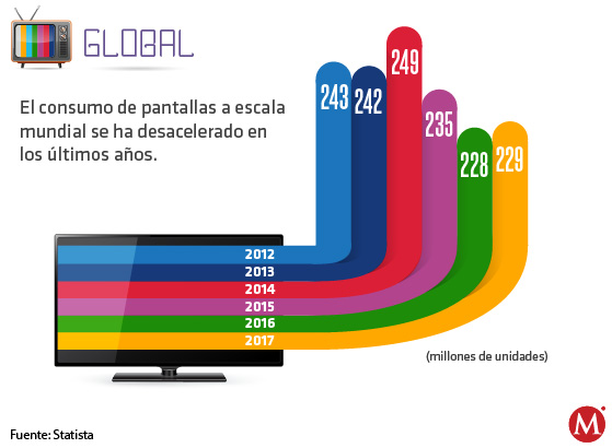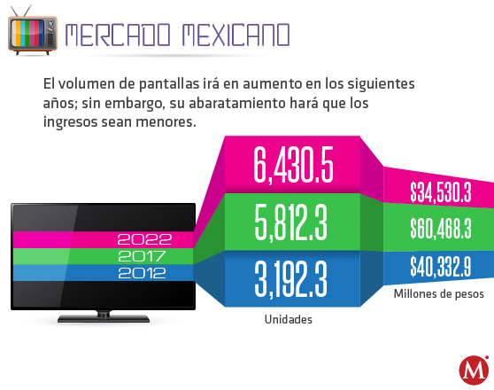 Cifras de la consultora Euromonitor International destacan que en 2017 el mercado de televisiones y pantallas alcanzó un volumen de 5.8 millones de unidades y se espera que para 2022 alcance un monto por 6.4 millones de unidades.