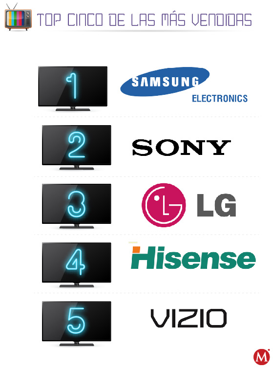 Entre las marcas más importantes dentro del sector en el país se encuentran Samsung, con 17 por ciento de participación; Sony, con 16 por ciento del mercado y LG, con 15.1 por ciento de cuota. A estas marcas les siguen Hisense y Vizio.