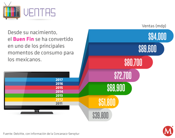 Según un estudio Deloitte, en el la edición del Buen Fin 2014 la ropa y pantallas fueron las categorías más importantes. Para 2015 las ventas de dichos aparatos electrónicos representaron cerca de 21 por ciento; para 2016 bajó a 16 por ciento; mientras y el año pasado repuntó a 18 por ciento.