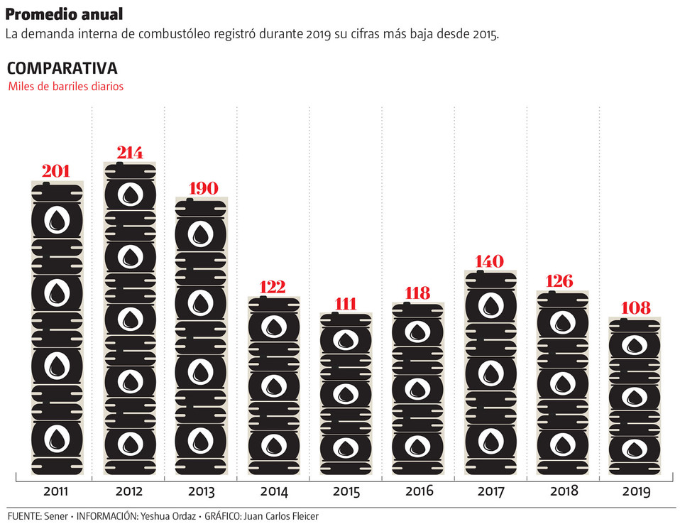 La producción promedio anual de combustóleo de Pemex para 2020 será de 164 mil barriles diarios, cifra mayor a los 149.8 mil toneles producidos en 2019.