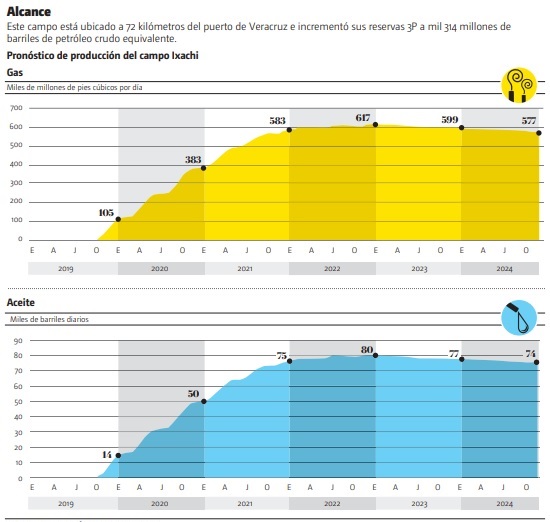 Actualmente Ixachi tiene una producción de 3 mil 900 barriles diarios de crudo y 30 millones de pies cúbicos de gas. Para finales del sexenio se prevé que aumente a 80 mil de petróleo de alta calidad y 600 millones de gas.