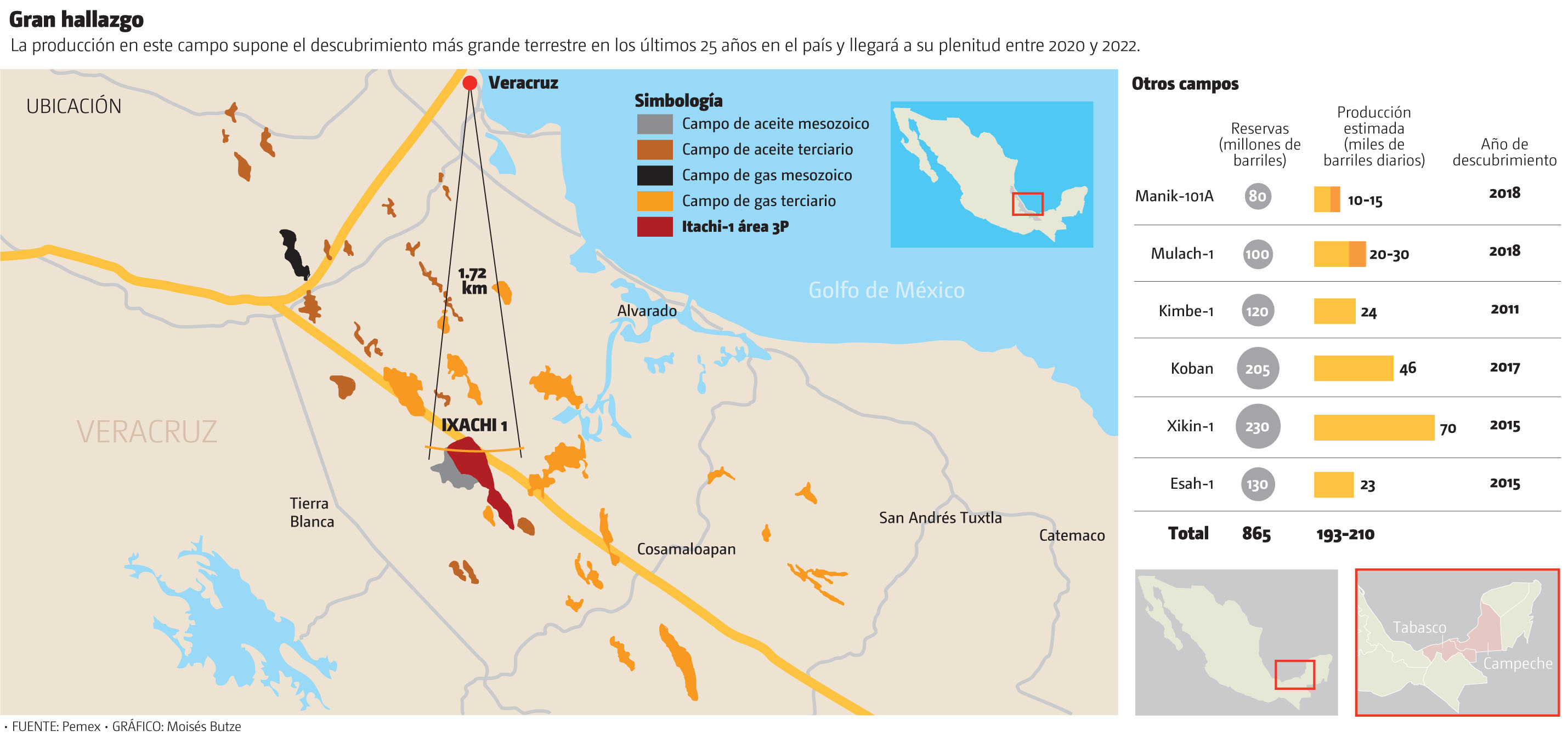 Luego de realizar los trabajos de delimitación en el campo Ixachi, Petróleos Mexicanos (Pemex) incrementó las reservas 3P —probadas, probables y posibles— a más de mil millones de barriles de petróleo crudo equivalente (desde las 360 millones previas), convirtiéndose en el descubrimiento más importante en tierra en los últimos 25 años, señaló Carlos Treviño, director general de la petrolera.