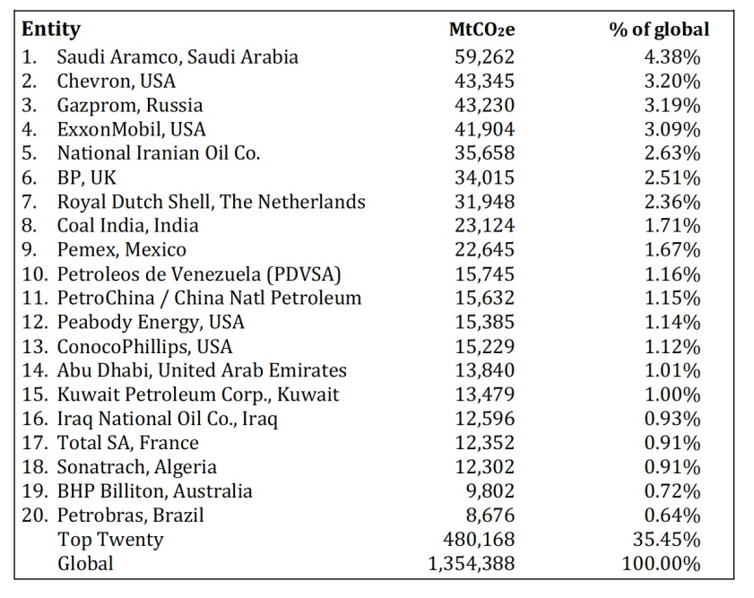 CAI revela cuáles son las 20 empresas de petróleo, gas natural y carbón que más han contribuido a la crisis climática de 1965 a 2017.Señala que estas veinte han emitido 480 mil millones de toneladas de CO2 y metano en ese periodo, lo que equivale a 35% "de todas las emisiones de combustibles fósiles y cemento en todo el mundo" en ese periodo.