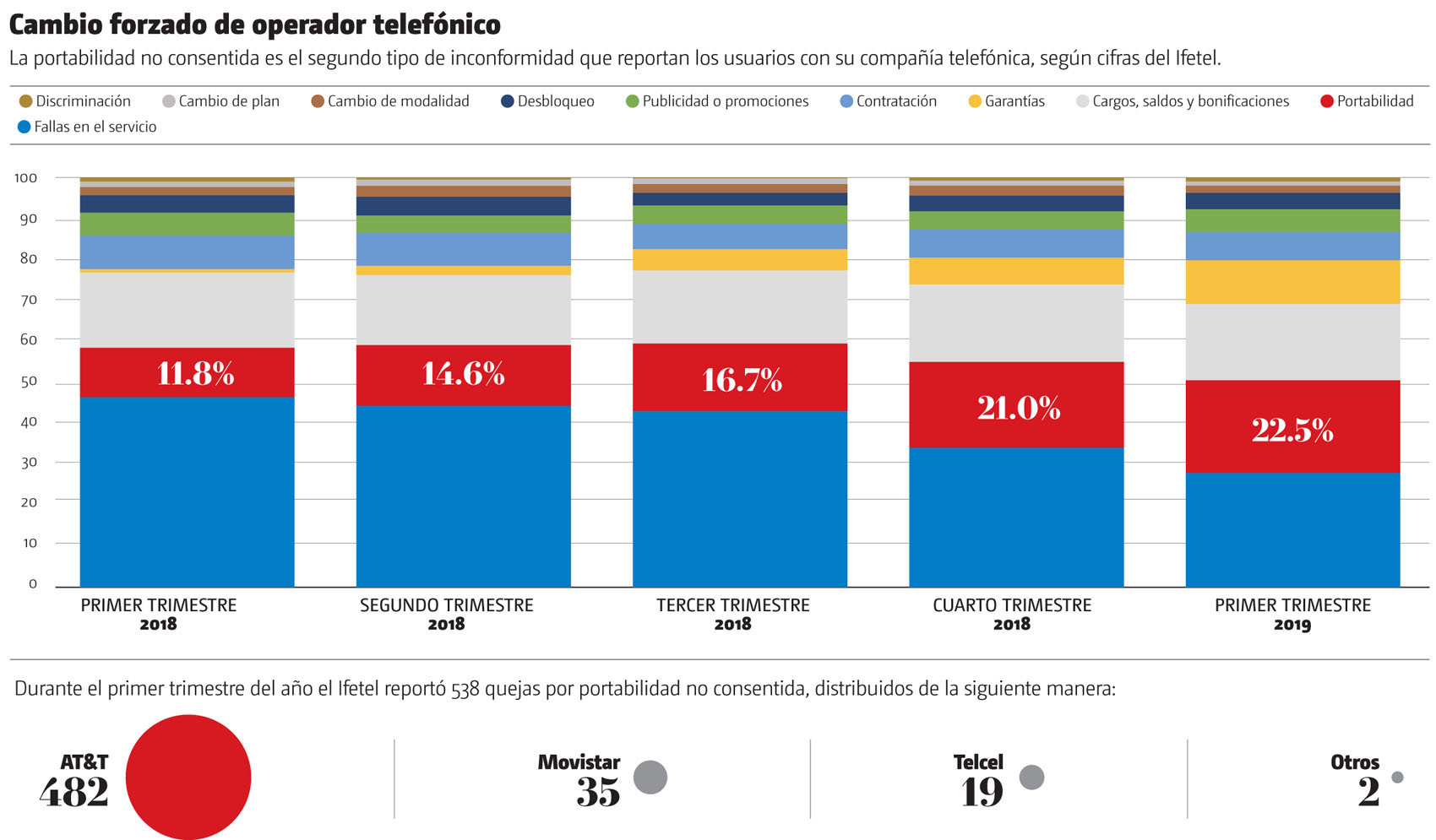 Durante el primer trimestre del año el Instituto Federal de Telecomunicaciones (Ifetel) registró 538 casos por “portabilidad no consentida”, mismos que se canalizaron al operador en el que el usuario deseaba permanecer. AT&T encabezó la lista de este tipo de quejas con 482 durante los primeros tres meses de este año, le siguió Movistar con 35 y Telcel con 19.