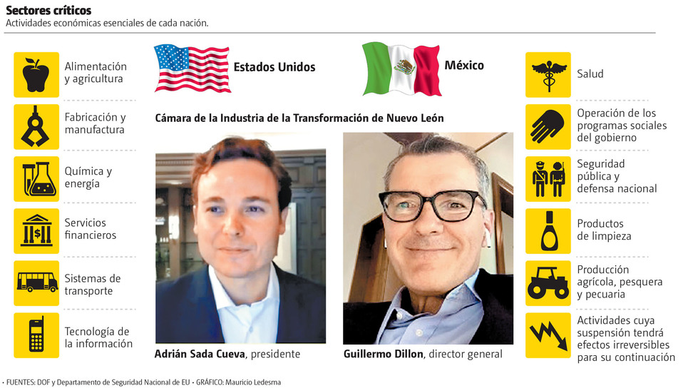 La Cámara de la Industria de la Transformación de Nuevo León (Caintra) solicitó al gobierno federal que se homologuen las actividades esenciales que se tienen en Estados Unidos (EU) con las dispuestas en México para la contención del coronavirus, ya que hay sectores de integración con entre ambos países.