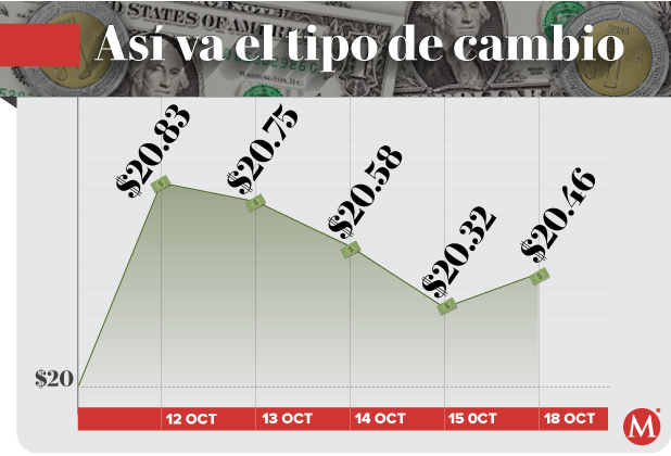 El Banco de México (Banxico) registró la sesión del viernes 15 de octubre un tipo de cambio de 20.46 pesos por dólar.