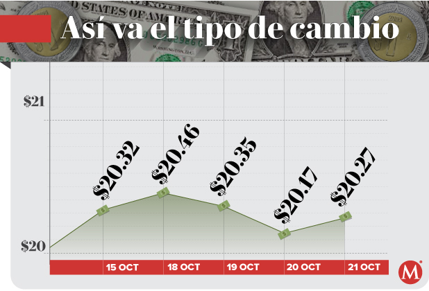 Durante la sesión, se espera que el tipo de cambio cotice entre 20.22 y 20.39 pesos por dólar.