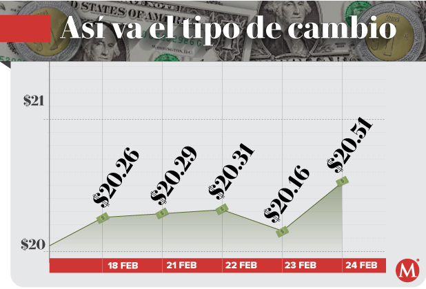 Primero. En el mercado cambiario, el peso inicia la sesión con una depreciación de 1.31 por ciento o 26.5 centavos, cotizando alrededor de 20.51 pesos por dólar, con el tipo de cambio tocando un mínimo de 20.2378 y un máximo de 20.57 pesos, el resto de las divisas pierde terreno, con el peso mexicano ubicándose en la posición 14 entre las más depreciadas.
