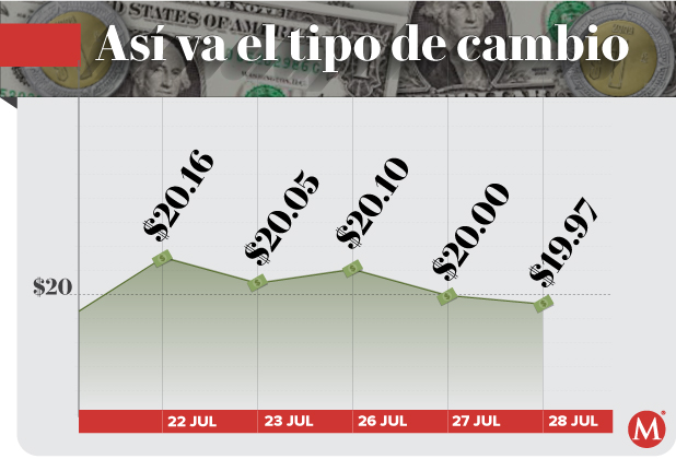 El Banco de México (Banxico) registró la sesión previa un tipo de cambio de 19.97 pesos por dólar.