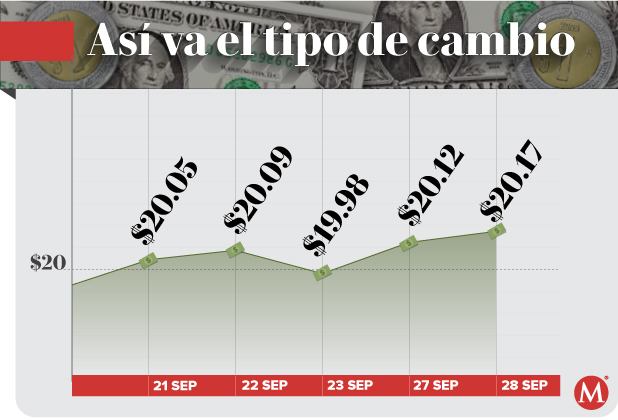 Banco Base publicó en su reporte que el peso inicia la sesión con una depreciación de 0.78 por ciento o 15.69 centavos, cotizando alrededor de 20.26 pesos por dólar, con el tipo de cambio tocando un mínimo de 20.09 y un máximo de 20.27 pesos por dólar, nivel que no había sido alcanzado desde el pasado 27 de agosto.