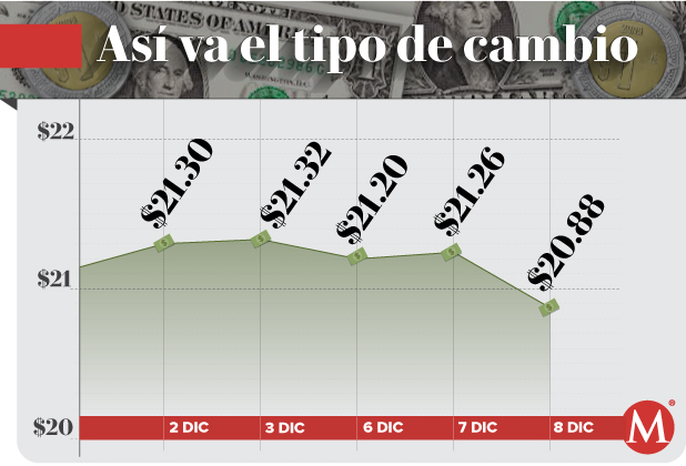 Banco base publicó, en su reporte, que el peso inicia la sesión con una apreciación de 0.52 por ciento, o 10.9 centavos, cotizando alrededor de 20.93 pesos por dólar.