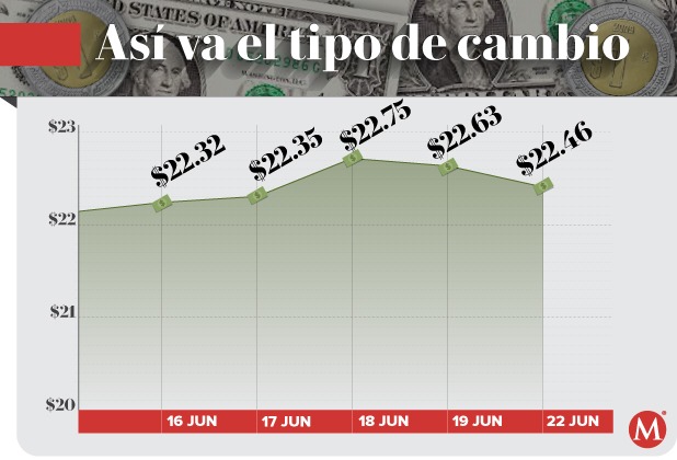 en 22.46 pesos por dólar, con una ganancia de 0.73 por ciento.