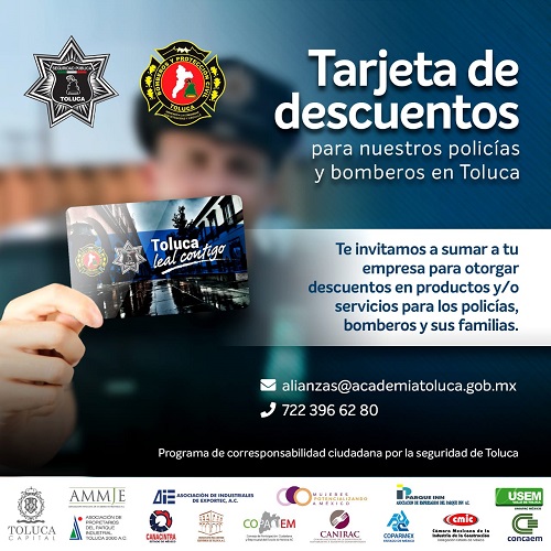 A través de la tarjeta "Toluca Leal Contigo" integrantes del Consejo de Cámaras y Asociaciones Empresa del Estado de México (Concaem), ofrecerán descuentos y beneficios para policías y bomberos de Toluca.