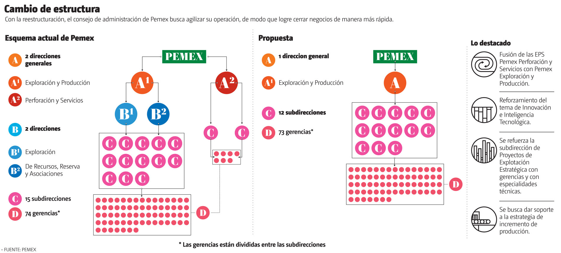 Con la reestructura que lleva a cabo Petróleos Mexicanos (Pemex), donde se fusionan en dos cuatro de sus subsidiarias, se pretende agilizar su capacidad de hacer negocios y decidir mejor qué proyectos ayuden a la empresa a no endeudarse más; además de que contribuirá a definir su capacidad de asociarse o contar con compañías privadas que asuman riesgos financieros, explicó Ramsés Pech, asesor y analista de la industria energética.