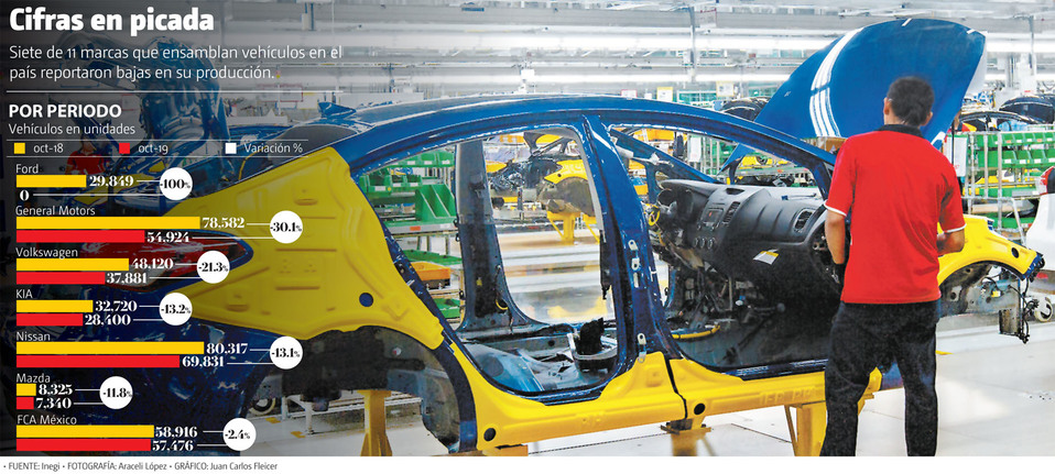 Por la caída en el mercado interno, así como por cambios en las plataformas de producción y la huelga de General Motors en Estados Unidos, en octubre pasado la producción de vehículos se ubicó en 311 mil 150 unidades, lo que significó una caída de 16.35 por ciento, la más grande de los últimos 30 años.