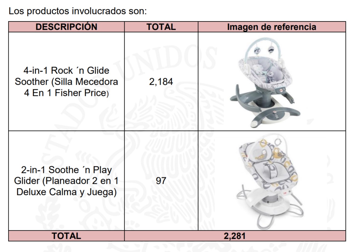 La dependencia federal explicó que se trata de 2 mil 281 piezas enviadas a México: 97 del producto 2-in-1 Soothe’n Play Glider (Planeador 2 en 1 Deluxe Calma y Juega), y 2 mil 184 del 4-in-1 Rock’n Glide Soother (Silla Mecedora 4 en 1 Fisher Price).