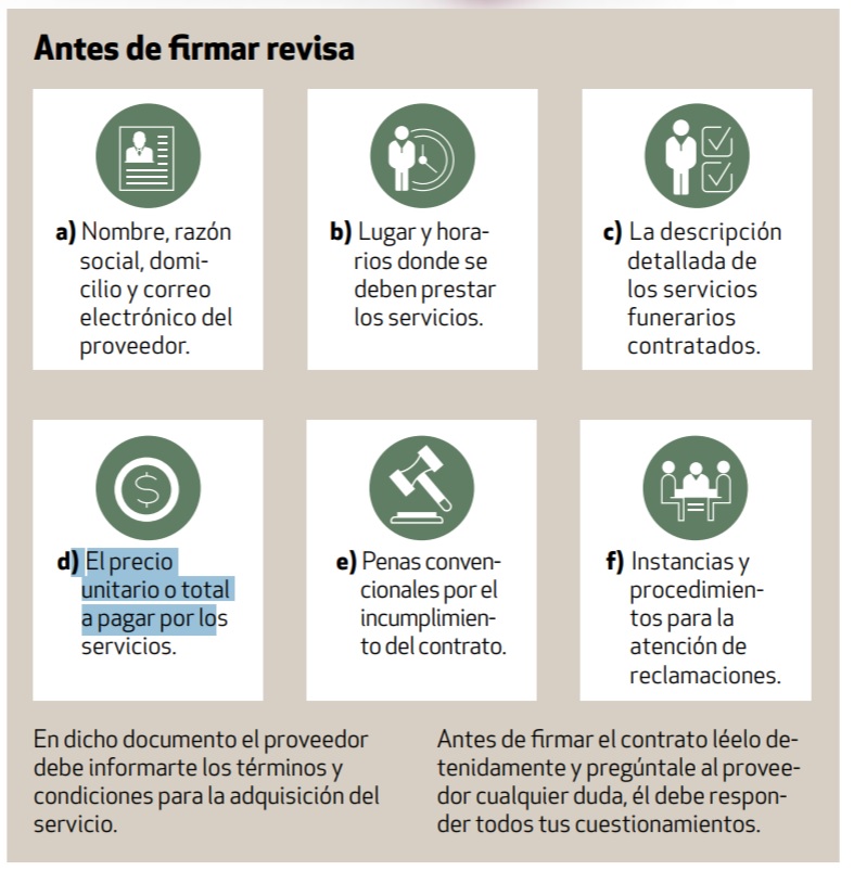 Antes de firmar revisa con una funeraria para llevar a cabo las exequias cuando alguien fallece si incluye el servicio para la recepción, traslado, preparación estética, embalsamamiento y conservación transitoria del cuerpo, así como el uso de capillas para velación, servicios de inhumación, exhumación o cremación.