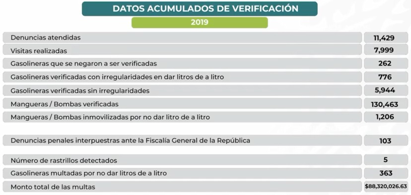 De enero a diciembre el organismo atendió once mil 329 denuncias, detectó irregularidades en 776 estaciones e inmovilizó mil 206 mangueras/bombas. Además, agregó Sheffield, "a partir del primero de enero Profeco cobrará sus propias multas, entonces ya no habrá esa distancia entre la sanción y la conducta que se está sancionando".