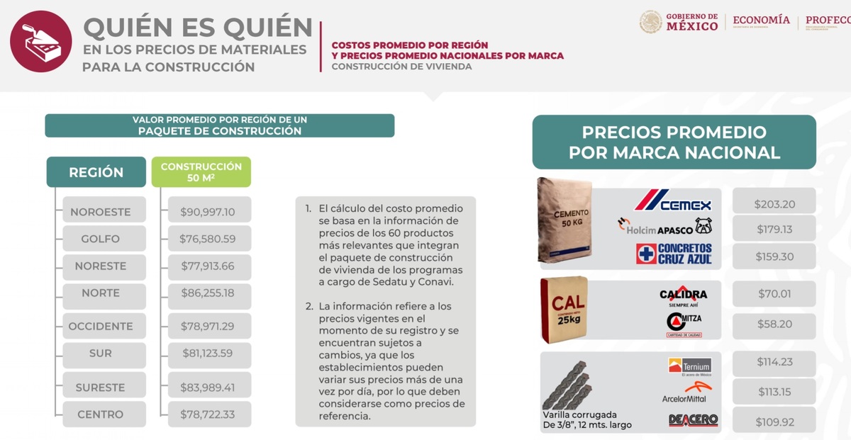 En conferencia y en el marco del lanzamiento de la herramienta ¿Quién es quién en los precios de los materiales de construcción? El titular de la dependencia, Ricardo Sheffield, expuso que en promedio, en una construcción de 50 metros cuadrados en esta zona se pueden destinar hasta 90 mil 997 pesos; en contraste, en la región Golfo para un complejo del mismo tamaño se requieren cerca de 76 mil 580 pesos.