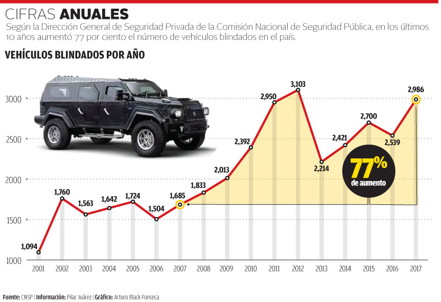 En los cinco años recientes el promedio de blindaje es de 2 mil 500 coches blindados en el país, de los cuales 70 por ciento se ubica en los niveles de blindaje 3, relacionados con violencia urbana.