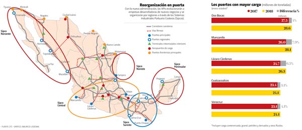 La reorganización de las APIs será por regiones a través de los llamados Sistemas Industriales Portuario Costeros (Sipcos) en el que se buscará la integración de los puertos con parques industriales regionales, sistemas modernos de comunicación satelital, centros de enseñanza superior y tecnológica, así como cadenas logísticas y desarrollos urbanos y servicios asociados para la población.