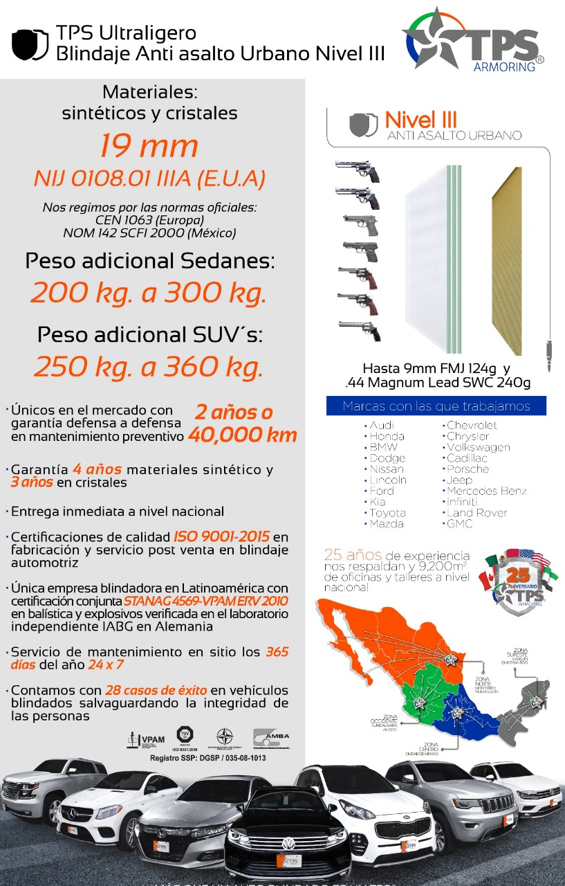 En un país en el que los índices de delincuencia van al alza y el robo de coches es uno de los delitos que ha repuntado en la Ciudad de México, Guadalajara y Monterrey, lo mejor es proteger tu integridad y tu patrimonio con métodos de seguridad como los que ofrece TPS Armoring. Un blindaje Ultraligero anti asalto urbano nivel III con las garantías que ninguna blindadora te ofrece como dos años de garantía o 40 mil kilómetros, de defensa a defensa en mantenimiento preventivo y Garantía de 4 años en materiales sintéticos y 3 años en materiales trasparentes (cristales blindados) para este nivel.