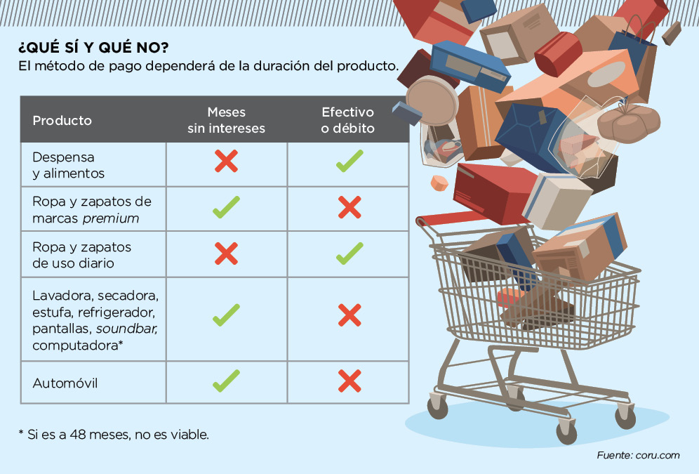No obstante, los meses sin intereses no son malos, menciona el especialista, “solo hay que saber utilizarlos, sobre todo, en los departamentos donde es viable adquirir productos a muy buen precio y con pagos diferidos, como la línea blanca y electrónicos”.