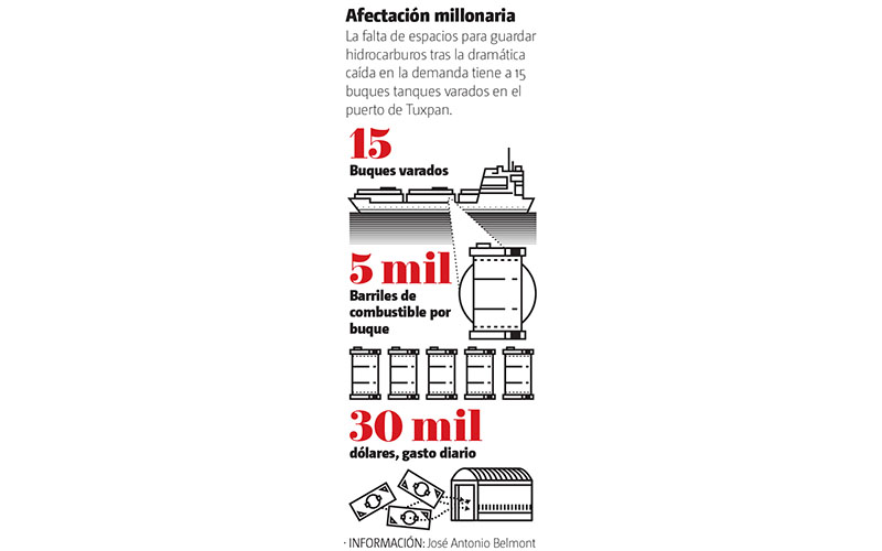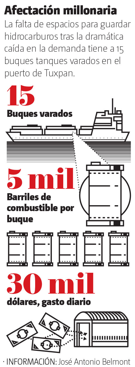 Mientras esto pasa en las estaciones de servicio del país, el puerto de Tuxpan, en Veracruz, eminentemente petrolero, es testigo de una de las principales razones de la caída del precio del petróleo acentuada por la crisis sanitaria: la escasez de espacio para guardar el hidrocarburo ante la dramática caída en su demanda.