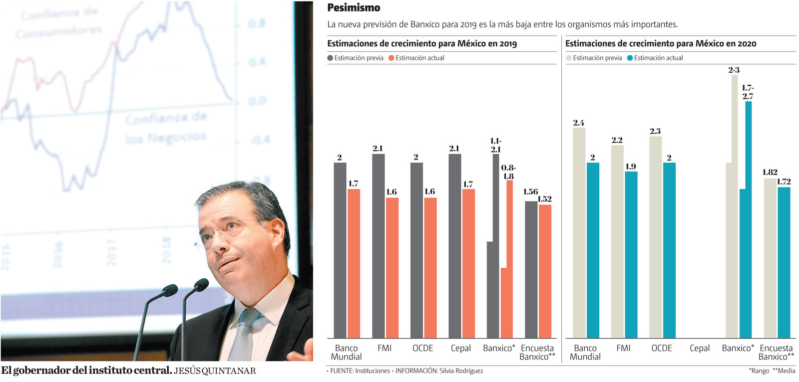El banco central estima que en 2019 el producto interno bruto (PIB) crezca en un rango de entre 0.8 y 1.8 por ciento, por debajo del cálculo previo de entre 1.1 y 2.1 por ciento; para 2020 el intervalo se mantuvo sin cambio, entre 1.7 y 2.7 por ciento.