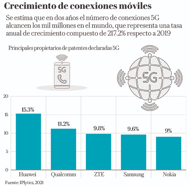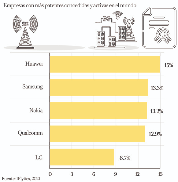 Con base en el análisis de IPlytics, Huawei lidera los principales propietarios de familias de patentes declaradas 5G, con una participación de más de 15.39 por ciento, seguido de Qualcomm, con 11.24; ZTE, 9.81; Samsung, con 9.67, y Nokia, con 9.01 por ciento.