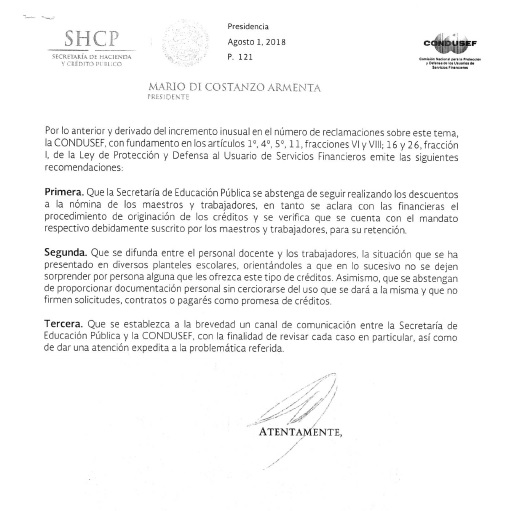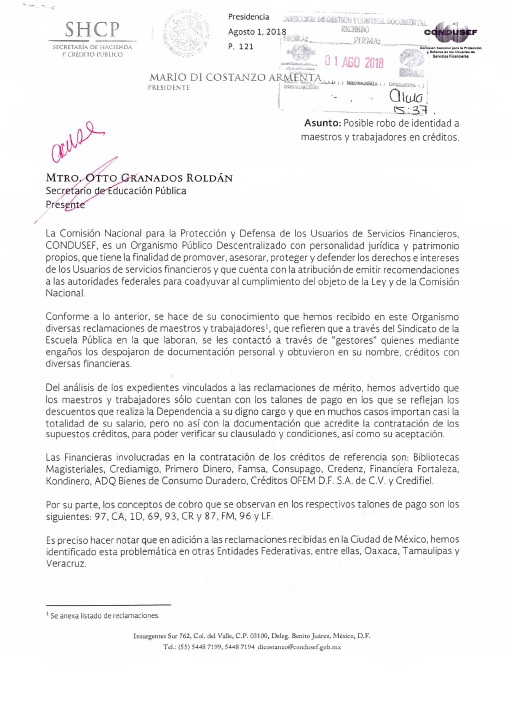 “Del análisis de los expedientes vinculados a las reclamaciones de mérito, hemos advertido que los maestros y trabajadores sólo cuentan con los talones de pago en los que reflejan los descuentos que realiza la Dependencia a su digno cargo y que en muchos casos importan casi la totalidad de su salario, pero no así con la documentación que acredite la contratación de los supuestos créditos, para poder verificar su clausulado y condiciones, así como su aceptación”, señala el oficio firmado por Mario Di Costanzo, presidente de la Condusef.